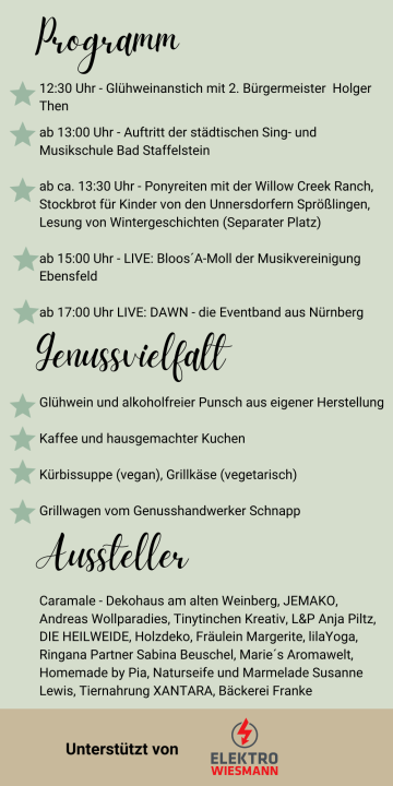 Auch dieses Jahr dürfen sich die Gäste des Hofwintermarkts auf handwerkliche Produkte und einer Auswahl an saisonaler Dekoration, liebevoll gestalteten Geschenkideen und kulinarischen Köstlichkeiten freuen. Die besonderen Highlights sind: Ponyreiten mit der Willow Creek Ranch, Stockbrot, Kinder Mal-Ecke, Auftritt der städtischen Sing- und Musikschule Bad Staffelstein, Bloo´s A-Moll und die Eventband DAWN aus Nürnberg.