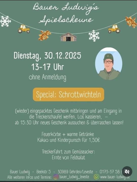 Die Spielscheune bei Bauer Ludwig in Leveste öffnet am 30.Dezember, von 13 bis 17 Uhr wieder ihre Türen. Kinder können toben, spielen, Gemüse ernten, mit dem Trecker mitfahren, Raps Öl pressen und alle Spiel Fahrzeuge testen.