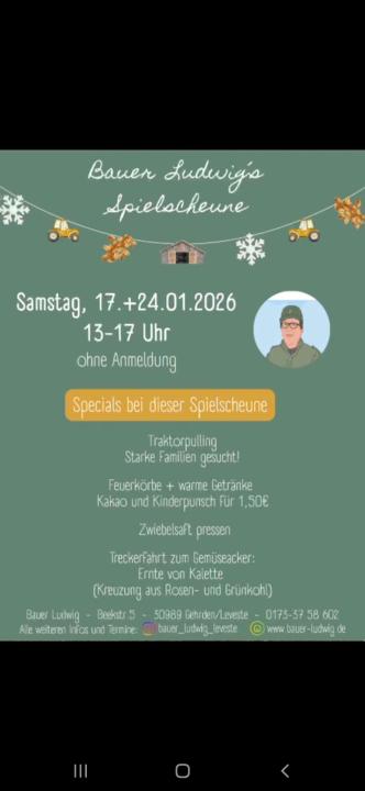 Die Spielscheune bei Bauer Ludwig in Leveste öffnet am 17.1 und 24.1 von 13 bis 17 Uhr wieder ihre Türen. Kinder können toben, spielen, hüpfen, Schaukeln im Getreideberg, mit dem Trecker mitfahren, Glücksrad, Dosen werfen und alle Spiel Fahrzeuge testen....