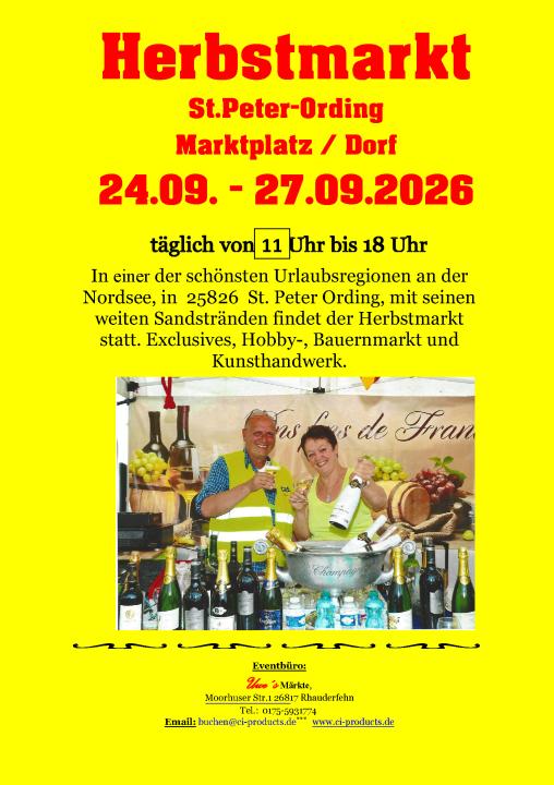 Eine alte Tradition wird fortgesetzt. Gleichermaßen beliebt ist der Herbstmarkt in St. Peter-Ording bei Kunsthandwerkern, Hobbyhandwerkern und Bauernmarkt Ausstellern, aber auch den zahlreichen Besuchern und Touristen. Angeboten werden dekorative und seltene Exponate aus den Bereichen Glaskunst, Silberschmuck, hochwertigem Leder, Filz, Holzarbeiten, Käse, Wurst, Obst und Gemüse, Bernstein, Haarstyling – und Kunst, Gewürze, Kunstschmiedearbeiten, Skulpturen und allerlei Gesundem. Der Ostermarkt findet, wie gewohnt, auf dem Marktplatz Schulstraße, in St. Peter-Ording-Dorf statt. Wir bevorzugen Anbieter mit weißen, oder beigen Zelten. Bunte Zelte sind nicht gerne gesehen. Des Weiteren werden keine Einzeltage vergeben. Begleitfahrzeuge müssen vom Veranstaltungsgelände entfernt werden, Wohnmobile oder Wohnwagen auf Campingplätze oder Reisemobilstellplätze. Die Öffnungszeiten sind täglich von 11:00 bis 18:00 Uhr. Wer sich berufen fühlt an einem dieser Events zu partizipieren, der möge sich bald melden, um sich einen der begehrten Standplätze zu sichern. Gerne auch unter Ci-poducts.de. Der Eintritt ist frei. Parkplätze sind ausreichend verfügbar. 25826 St. Peter Ording, Schulstraße 1, Marktplatz vom 24.09. - 27.September 2026 - 4 Tage