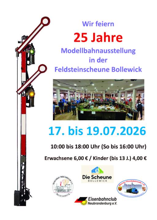Am 17. Juli 2026 eröffnen wir zum 25. Mal die große Gemeinschaftsausstellung in der Feldsteinscheune Bollewick. Von Freitag 10:00 Uhr bis Sonntag 16:00 Uhr kommen alle Freunde der Modelleisenbahn in der Feldsteinscheune wieder voll auf ihre Kosten. Der Eisenbahnclub Neubrandenburg, der Karow-Lübzer Modellbahn-Club und die Warener Eisenbahnfreunde präsentieren wieder Neues, aber auch altbewährtes aus ihren Vereinen. Schauen, Staunen, Spielen und Kaufen.
