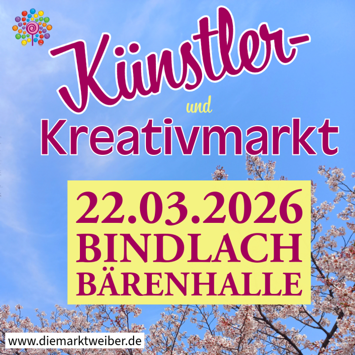 Freuen Sie sich auf unseren Künstler- und Kreativmarkt am 22.03.2026 in der Bärenhalle in Bindlach, der wie jedes Jahr ein echter Besuchermagnet ist. Nichts ist hier „von der Stange“. Über 100 Aussteller/innen präsentieren ihre handgemachten Produkte aus den unterschiedlichsten Materialien. Mit dabei sind wieder schöne Dinge aus Holz und Keramik, originelle Stücke für Haus und Garten, wundervolle Arbeiten aus den unterschiedlichsten Materialien, herrlich duftende Seifen, Deko aus alten Fenstern, Töpferarbeiten, Geschenkverpackungen aller Art, selbstgemachte Liköre aus der Region, handgemachter Schmuck, Selbstgenähtes für Groß und Klein, Naturprodukte, Upcycling-Produkte, Biobrote und Aufstriche, handgewebte Teppiche und natürlich schöne Dinge zu Ostern. Kulinarisch verwöhnen wir Sie wieder mit Kaffee und unseren auch hausgebackenen Kuchen und natürlich gibt es auch Bratwurst und leckere Steaks vom Grill. Nutzen Sie diesen Sonntag im Frühling und erfreuen Sie sich an den schönen einzigartigen Dingen, welche mit viel Liebe hergestellt wurden.