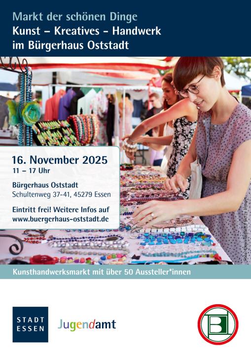 Kunsthandwerksmarkt im Bürgerhaus Oststadt, Essen am 16.11.25 von 11-17 Uhr: Über 50 Ausstellerinnen und Aussteller mit regionalem Bezug präsentieren buntes Handwerk, einzigartige Schmuckstücke, Keramik, Textilkunst, Holzarbeiten und mehr. Entdecken Sie regionale Kunst, erfahren Sie Hintergründe aus erster Hand und finden Sie besondere, handgefertigte Schätze. Für das leibliche Wohl ist ebenfalls gesorgt. Kommen Sie vorbei und unterstützen Sie lokale Kreativszene!