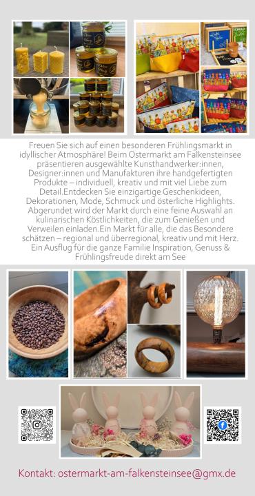 Freuen Sie sich auf einen besonderen Frühlingsmarkt in idyllischer Atmosphäre! Beim Ostermarkt am Falkensteinsee präsentieren ausgewählte Kunsthandwerker*innen, Designer*innen und Manufakturen ihre handgefertigten Produkte - individuell, kreativ und mit viel Liebe zum Detail. Entdecken Sie einzigartige Geschenkideen, Dekorationen, Mode, Schmuck und österliche Highlights. Abgerundet wird der Markt durch eine feine Auswahl an kulinarischen Köstlichkeiten, die zum Genießen und Verweilen einladen. Ein Markt für alle, die das Besondere schätzen - regional und überregional, kreativ und mit Herz. Ein Ausflug für die ganze Familie Inspiration, Genuss & Frühlingsfreude direkt am See.