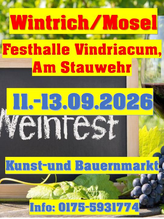 Kaum ist das Weinfest Bernkastel-Kues vorüber, geht es direkt weiter in Wintrich/Mosel mit einem kleineren, aber ebenso feinen Weinfest. Erstmals gibt es dort nicht nur Weinstände und sehr viele nette Besucher, sondern auch einen tollen Kunst- und Bauernmarkt. Die Lokalität im Ort ist sehr bekannt, direkt vor der Festhalle Vindriacum, Am Stauwehr. Geschichte: Wintrich selbst ist ein altes Weinbaudorf, das um 960 n. Chr. erstmals urkundlich erwähnt wurde. Die Weinbautradition ist tief in der Geschichte des Ortes verwurzelt, mit historischen Fachwerkhäusern, verwinkelten Gassen und alten Weingütern. Höhepunkte: Das Fest beinhaltet traditionell einen Festumzug, der viele Schaulustige anzieht, und die Krönung der neuen Weinkönigin, die am Freitagabend stattfindet. Atmosphäre: Das Weinfest ist bekannt für seine lebendige Atmosphäre, die durch Bands und eine Vielzahl von Gastronomiebetrieben geschaffen wird. Lasst uns daran teilnehmen, am Weinfest in Wintrich 2026